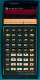 Mein Erster:Wohl eines der Topmodelle seiner Zeit: Auf der Gehäuseunterseite kann man ein Programmodul (ca. 1,5 x 2 cm groß) einsetzen, unterhalb des Displays ist ein Magnetkartenleser eingebaut. Die momentan aktive Magnetkarte kann zwischen Display und Tastatur eingeschoben werden und dient - entsprechend beschriftet - gleichzeitig als Legende, welche der fünf Funktionstasten in der obersten Tastaturreihe mit welcher Programmfunktion belegt ist. | TI 59 |